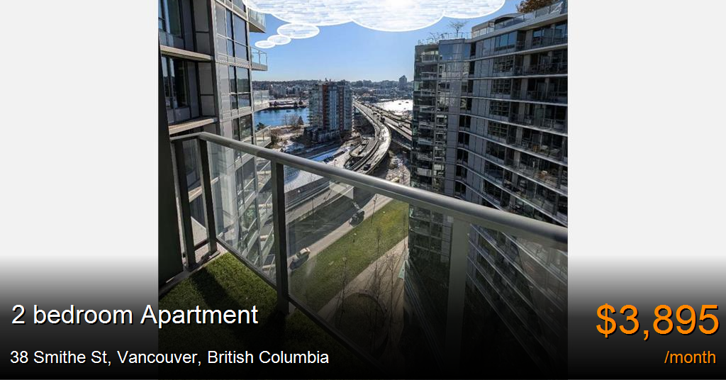 Apartment at 1751 38 SMITHE ST VANCOUVER V6B 0P3Available: Feb 15, 2025 (Possibly earlier than the 15th)Type: Unfurnished Rent and Term: $3,895 per month; Minimum one year Unit Space: 2 bedrooms, 2 bathrooms, 1 balcony, 1 flex room and 1 kitchen&living roomBuilding Built in: 2016Indoor Floor Area & Outdoor Balcony: 806 sq.ft & 45 sq.ftParking: One underground parking spot included in the rentLaundry: In-suite private laundryPets: One small dog or one cat if approved by the ownerNo Smoking