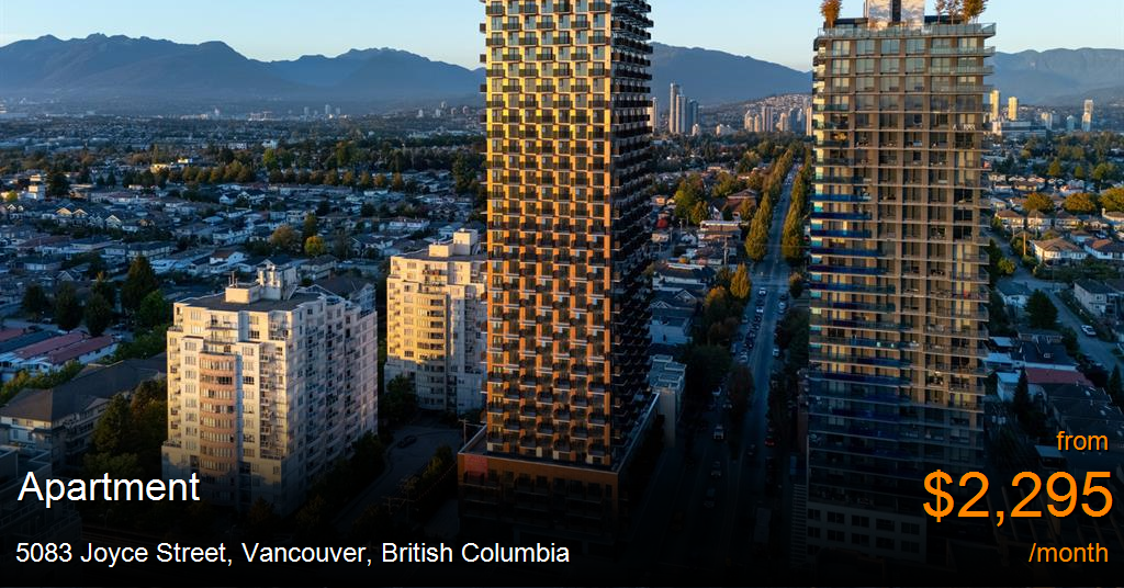 **Synopsis**Designed by Perkins&Will and developed by Westbank, 5055 Joyce is a striking tower inspired by northwest modernist architecture, featuring a dynamic vertical form and a welcoming public plaza. Residents enjoy a full suite of amenities designed for comfort, wellness, and connection — including a rooftop lounge with panoramic city views, a fully equipped fitness studio, coworking and virtual meeting spaces, a rooftop children’s play area, and a secure bike hub for everyday ease. High-speed managed WiFi is provided throughout the building, and all homes are pet-friendly.
