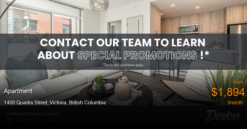 Apartment for rent in Victoria at 1400 Quadra Street. Receive 1 Month FREE RENT When You Sign a New 13 Month Lease (Select Units Only)The Beacon boasts 113 thoughtfully designed contemporary suites that feature modern finishes, including stainless steel appliances, quartz countertops, in-suite laundry, and balconies in the majority of the suites. Offering bachelor, one-, two-, and three-bedroom suites, The Beacon provides all the conveniences of condominium living without the unexpected costs, responsibilities, and stress of ownership. The fourteen-storey property also features an amenity room, dog run, outdoor patio with dining and lounge, and three levels of highly secured underground parking. Situated in the transit-oriented intersection of Johnson Street and Quadra Street, in the Harris Green neighbourhood within walking distance of an abundance of amenities. The Harris Green area is an attractive retail hub including numerous retail amenities such as coffee shops, liquor stores, restaurants, groceries, bakeries, and other major retailers.The Beacon offers modern rental apartments that are just steps away from all urban conveniences including grocery stores, gyms, shopping, and pharmacies. Enjoy the vibrant city life with beautiful downtown Victoria views, a fitness center, and an outdoor resident patio designed for your active and social lifestyle.Enjoy unlimited use of the panoramic outdoor terrace featuring a community BBQ dining area and residents lounge.Discover your new home where modern features meet superb accessibility.With a fitness centre, underground parking, bike storage, an outdoor terrace, and more, The Beacon at 1400 Quadra offers residents a new way of rental living in Downtown Victoria. Contact us now to book your in-person or Online tour(Facetime or Whatsapp Video Tours)*Terms and conditions apply. Select Units Only. To be eligible, you must be a new resident and sign a lease for the specified lease term. The offer is not applicable for those who transfer within the Devon Properties portfolio. This is a one-time offer and may be withdrawn or extended at any time by Devon Properties Ltd. Offers, benefits and services are subject to change and are not an essential, required, or ancillary service provided by the Landlord.