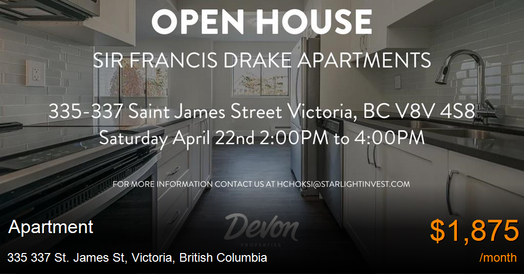 Apartment for rent in Victoria at 335 337 St. James St. Sir Francis Drake is a beautifully maintained four-storey wood-frame apartment building with 94 rental units, consisting of a blend of bachelor, one- and two-bedroom suites. All available suites have been renovated to a modern design, with large, open-concept kitchens, brand new stainless steel appliances, new cabinetry throughout and upgraded bathrooms. Sir Francis Drake is situated in James Bay, one of Victoria's most desirable residential neighbourhoods, just steps away from James Bay Square, Downtown Victoria, Beacon Hill Park and Dallas Road – providing all of life's necessary amenities within walking distance.